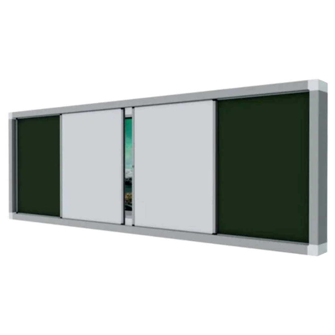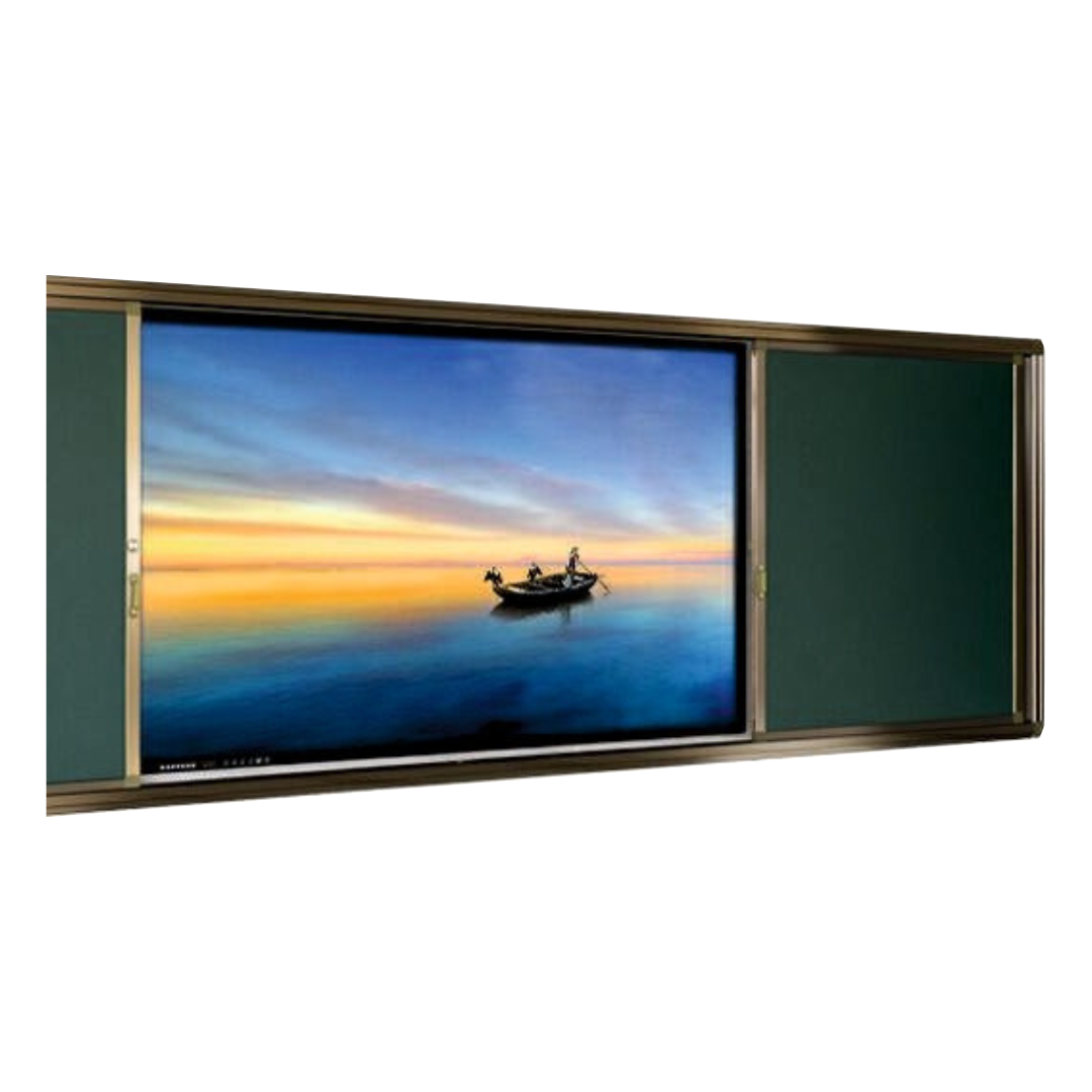 The Double Sliding Shutter Board is designed to combine modern digital teaching tools with traditional writing surfaces in a single, space-efficient system. It features two smooth-sliding panels that can easily move to reveal or cover the central display screen. The sliding shutters are available in both ceramic green chalkboard and whiteboard finishes, offering clear visibility, smooth writing performance, and long-lasting durability.